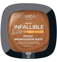 ¡La base en polvo sensación de internet Infalible 24h Freshwear ahora como bronceador! Con una fórmula de larga duración que dura hasta 24 horas, es ideal tanto para broncear y agregar calidez a la piel como para contornear. Tiene un acabado mate suave dejando la piel con un aspecto natural. Es una prueba de agua, calor y humedad, además de tener baja transferencia para usarlo todo el día.