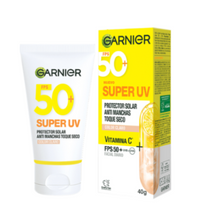 Garnier Super Uv Toque Seco con color Protector Solar Facial Diario, brinda una doble acción para tu piel mientras protege del sol gracias al FPS 50, te aporta luminosidad gracias a la vitamina C que actúa como antioxidante y combate las manchas causadas por el Sol.